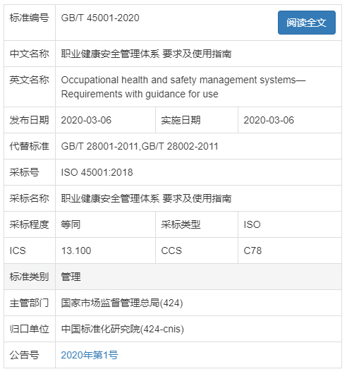 GB/T 45001(職業健康安全管理體系—要求及使用指南)2020年3月6日正式發布實施