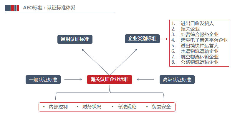截至目前,《海關(guān)認(rèn)證企業(yè)標(biāo)準(zhǔn)》體系為“1+8”模式,即,通用標(biāo)準(zhǔn)加進(jìn)出口收發(fā)貨人、報關(guān)企業(yè)、外貿(mào)綜合服務(wù)企業(yè)、跨境電子商務(wù)平臺企業(yè)、進(jìn)出境快件運(yùn)營人、水運(yùn)物流運(yùn)輸企業(yè)、航空物流運(yùn)輸企業(yè)、公路物流運(yùn)輸企業(yè)8個單項(xiàng)標(biāo)準(zhǔn)。